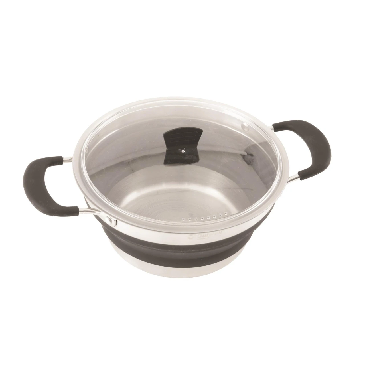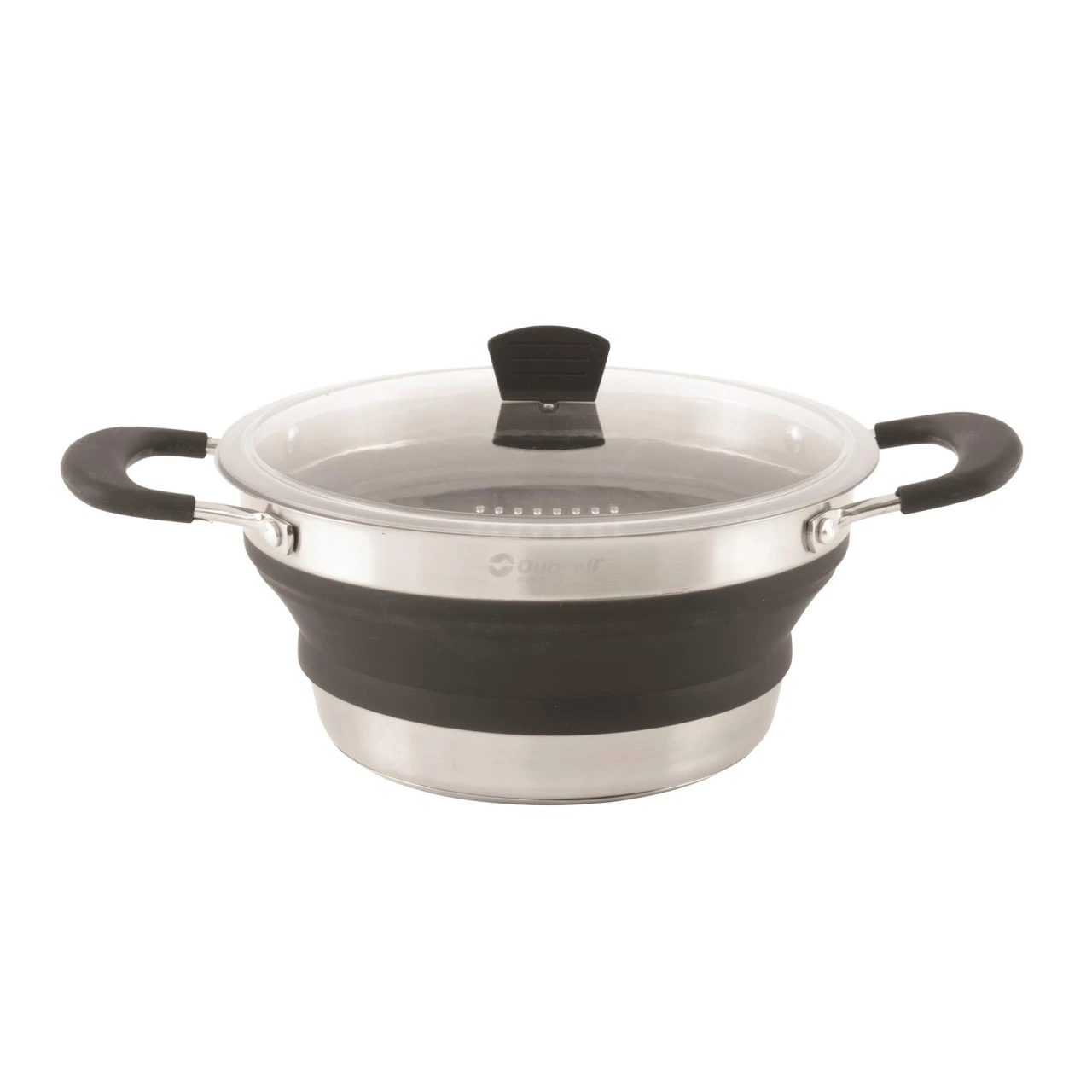 Mit dem Outwell Collaps Pot M kannst du dein Essen auf (fast) allen Hitzequellen zubereiten. Egal ob Gaskocher oder Elektroherd, der Collaps Topf M funktioniert durch seine Edelstahlplatte am Boden ideal. Der Deckel ist mit einer Öffnung zum Dampfaustritt versehen. Damit du den Topf sicher anfassen kannst, sind die Edelstahlgriffe mit einer Silikonschicht überzogen. Du kannst den Collaps Topf M sowohl im Haushalt, als auch auf deinen Campingausflügen benutzen, denn er lässt sich sehr flach zusammenfalten.