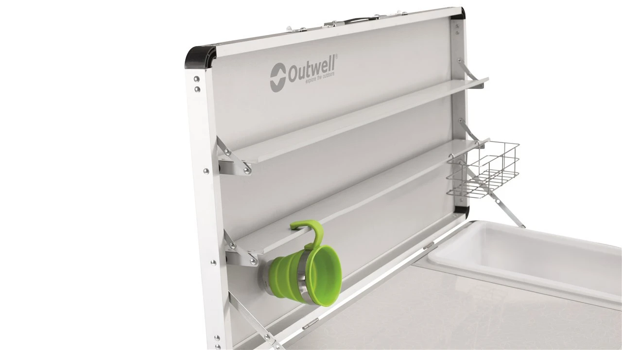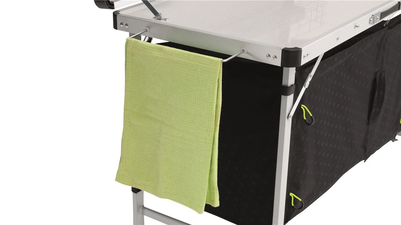Der Outwell Drayton Kitchen Table Küchentisch ist ein stabiler Küchentisch, welcher viel Platz hat, um dort zu kochen. Der Schrank bietet ausreichend Stauraum für Lebensmittel oder Geschirr. Die Türen zum Stauraum werden durch Magnete verschlossen. Außerdem hat der Küchentisch extra Mesh-Türen, damit Insekten nicht in den Stauraum gelangen. Im integrierten Wasserbecken kannst du dein Geschirr waschen. Deine Handtücher kannst du seitlich an der Arbeitsplatte aufhängen. Der Drayton Kitchen Table ist leicht aufzubauen und kann auf ein kleines Packmaß zusammengefaltet werden. Er kann bis maximal 30 kg belastet werden.