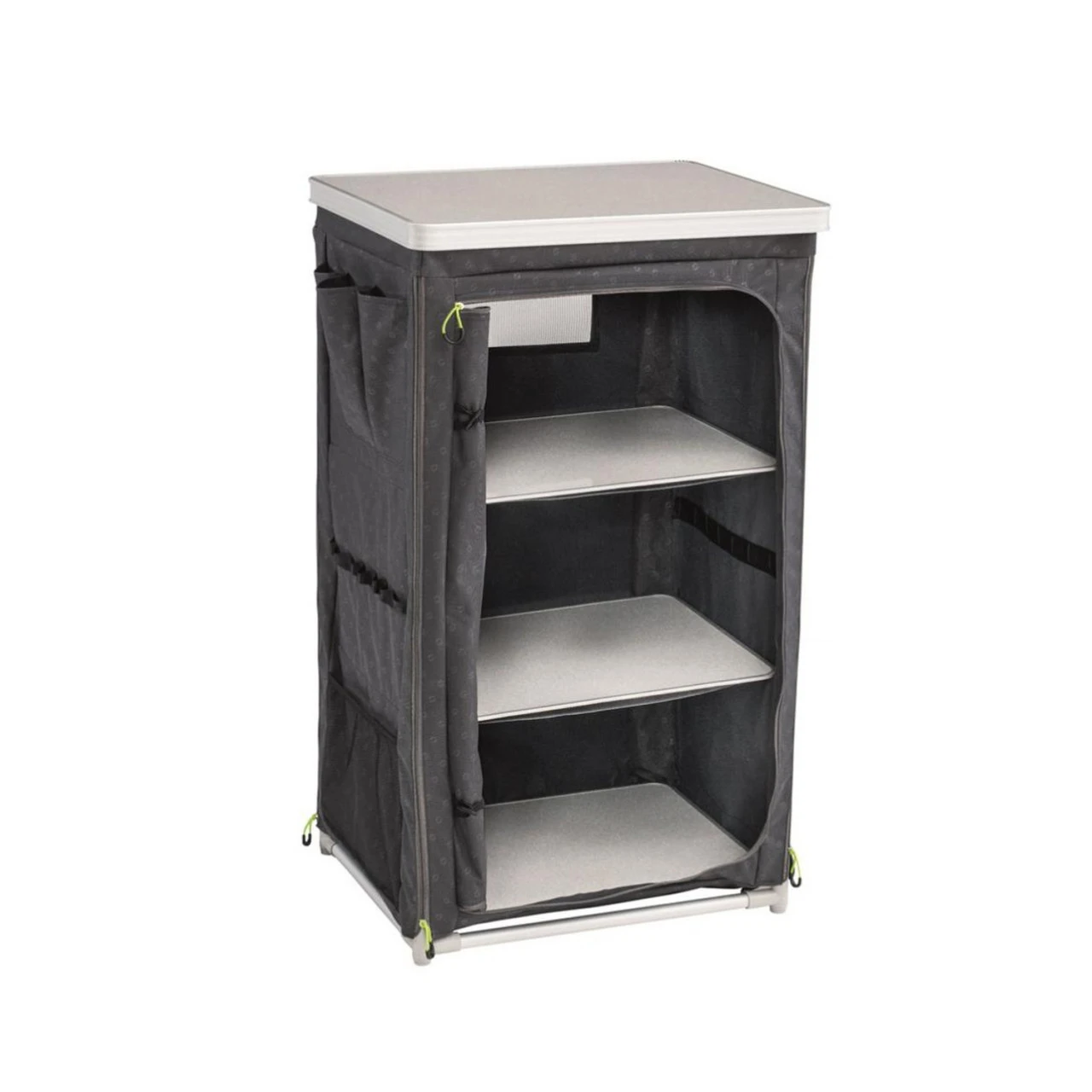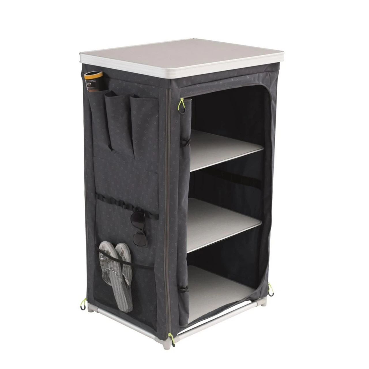 Der Outwell Milos Campingschrank begeistert mit seiner Vielseitigkeit. Er lässt sich innerhalb weniger Sekunden öffnen und wieder zusammenfalten. Ein internes Rahmensystem sorgt für ein großes Verhältnis von Innenvolumen zu Packungsgröße. Im Schrank befinden sich drei Regalböden, die mit Reißverschlusstüren verschlossen und über eine Netzbelüftung belüftet werden. Die Tür kann aufgerollt und seitlich befestigt werden. Ausserhalb des Milos Campingschranks befinden sich drei Taschen, in denen Platz für Kleinteile wie Dein Schlüssel oder Dein Handy ist. Kleine Haken organisieren Küchentücher oder ähnliches. In einer Netzbodentasche finden Schuhe einen geordneten Platz. Für einen optimalen Transport wurde der Campingschrank mit einer Tragetasche ausgestattet.